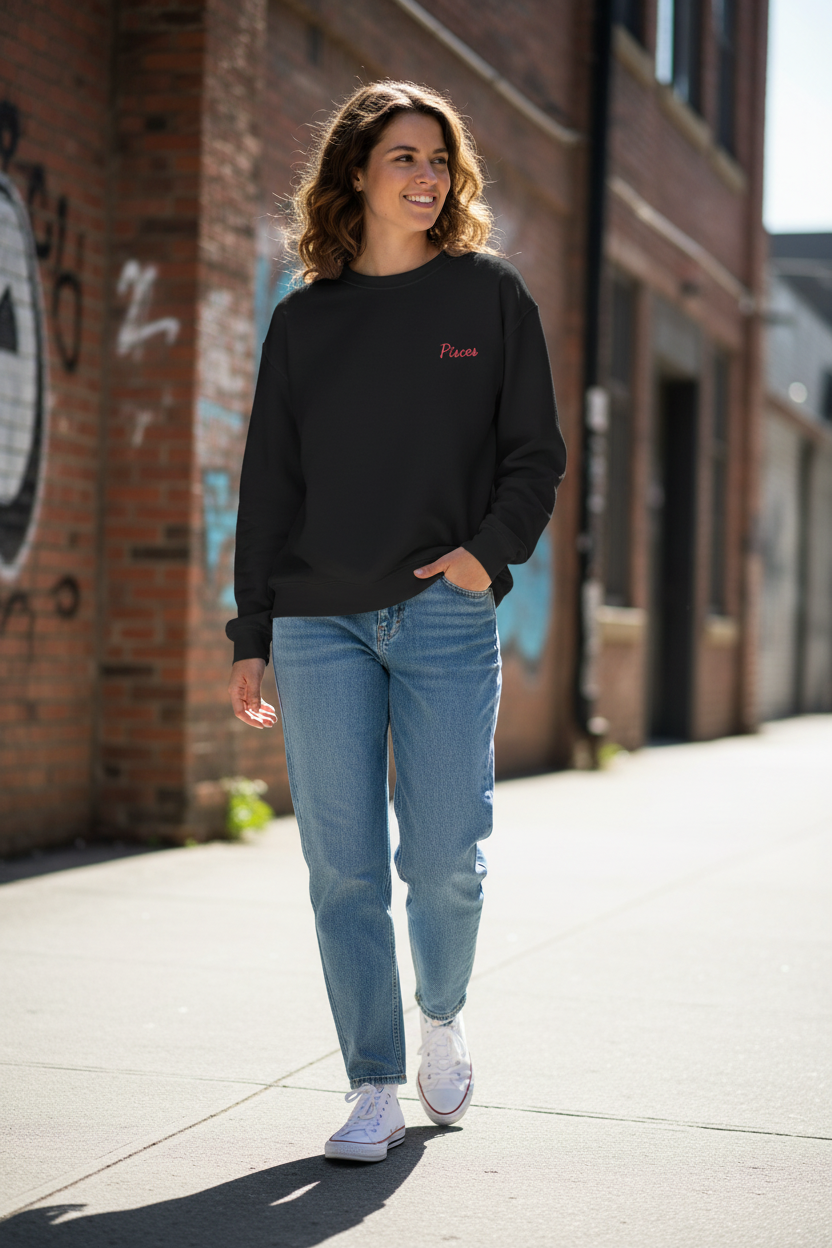This Pisces sweatshirt is for the ones who feel everything but don’t owe anyone an explanation. The red embroidered Pisces script keeps it soft and fluid—expressive without trying too hard. Quietly emotional, effortlessly cool.